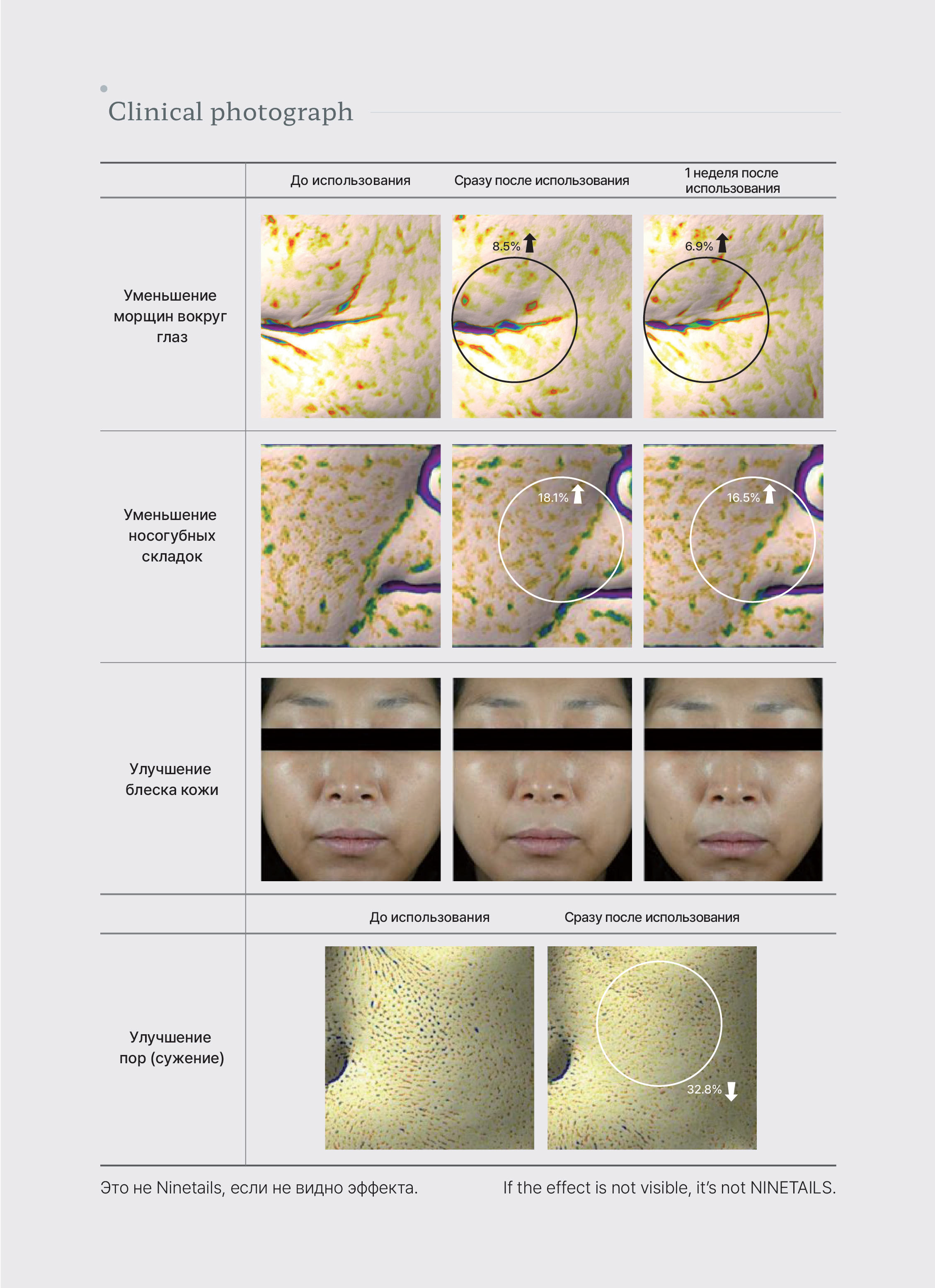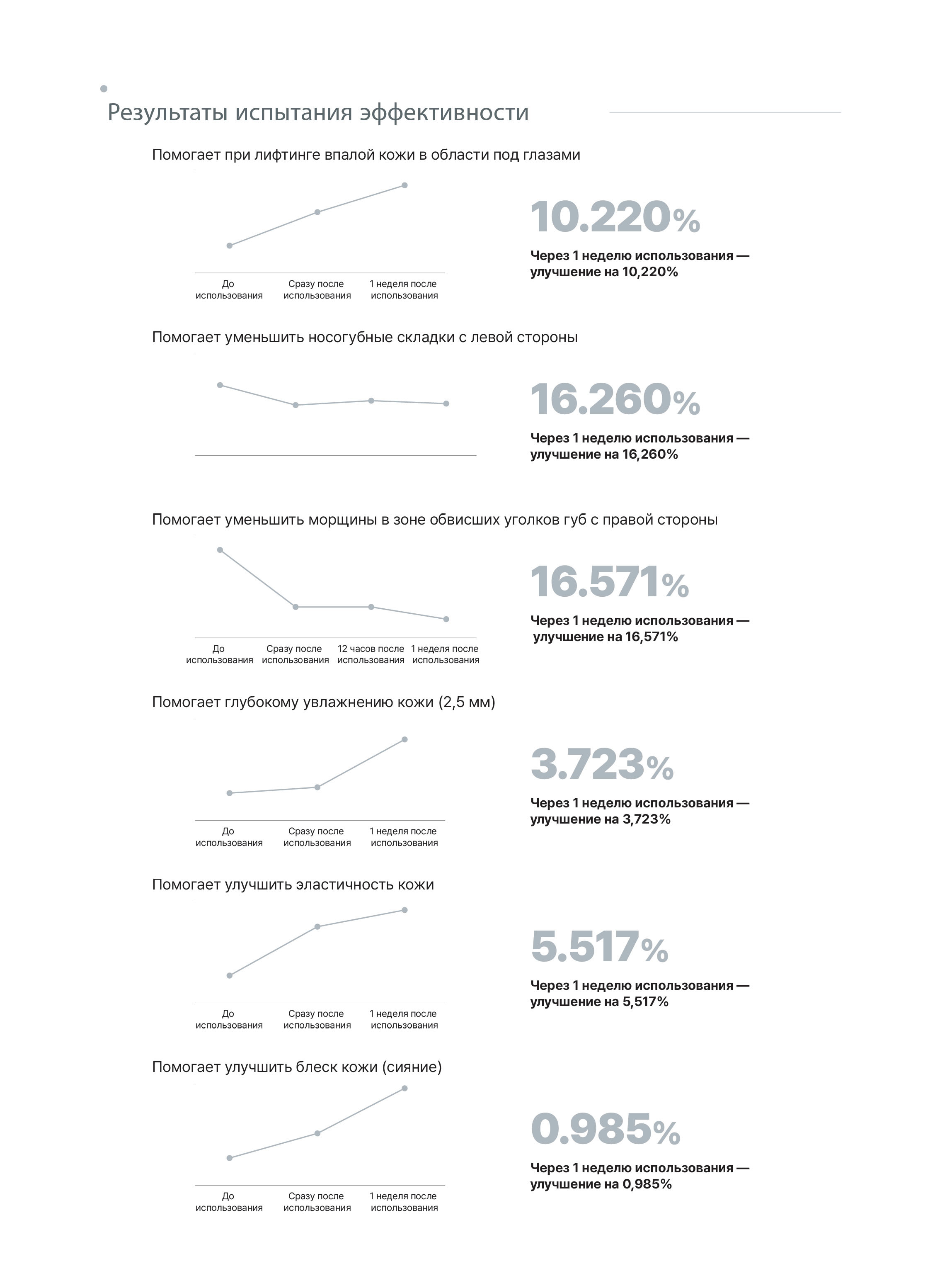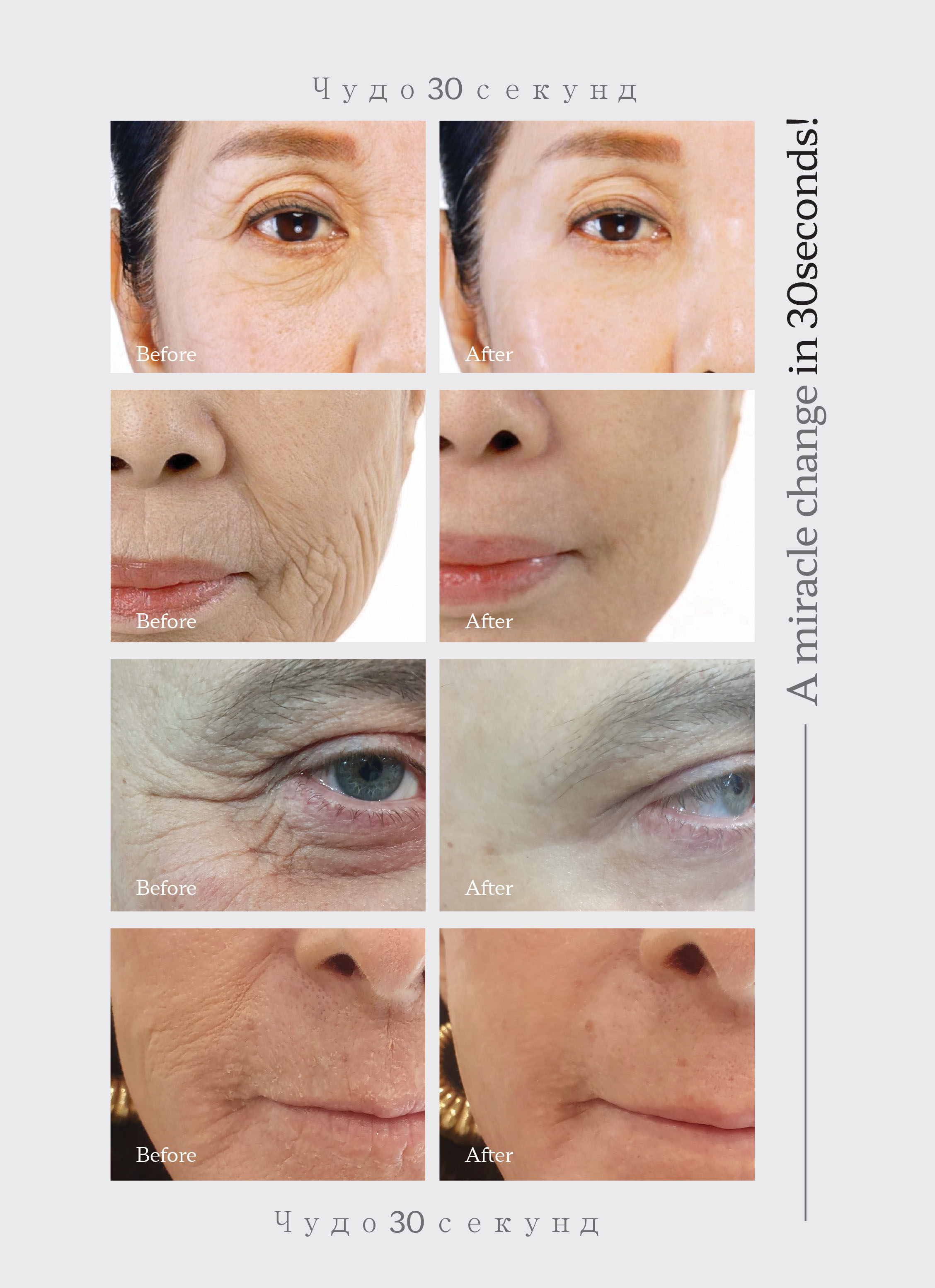 Эффект разглаживания морщин заметен уже через 30 секунд, и можно наблюдать два эффекта немедленное разглаживание морщин и реальное разглаживание морщин после 2-4 недель ежедневного использования.